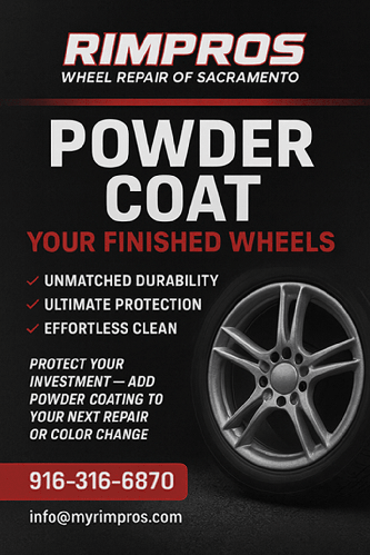 Sac Rim Pros Wheel Powder Coating service is a highly durable and aesthetically pleasing finish for your vehicle’s wheels, surpassing the performance of traditional paint. The process involves meticulous preparation, where the wheels are stripped of their existing finish, thoroughly cleaned, and often sandblasted to create an ideal surface for adhesion. Following prep, a dry powder (composed of pigment and resin) is electrostatically applied to the wheel’s surface. The wheel is then cured in a high-temperature oven, causing the powder to melt and chemically react to form a continuous, hard, and resilient coating that is resistant to chipping, scratching, fading, and corrosion from road salts and chemicals.
