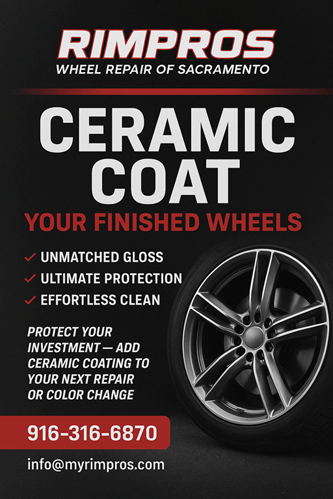 Sac Rim Pros Wheel Ceramic Coating provides a cutting-edge layer of protection specifically designed to endure the high-stress environment of automotive wheels, which are constantly exposed to brake dust, road grime, and extreme heat. This service involves applying a liquid polymer solution, which chemically bonds with the factory clear coat or the finish of the wheel. Once cured, the ceramic layer transforms into a semi-permanent, glass-like shield that is exceptionally hard and slick. This hydrophobic surface actively repels water and contaminates, making the wheels significantly easier to clean, drastically reducing the effort needed to remove baked-on brake dust.